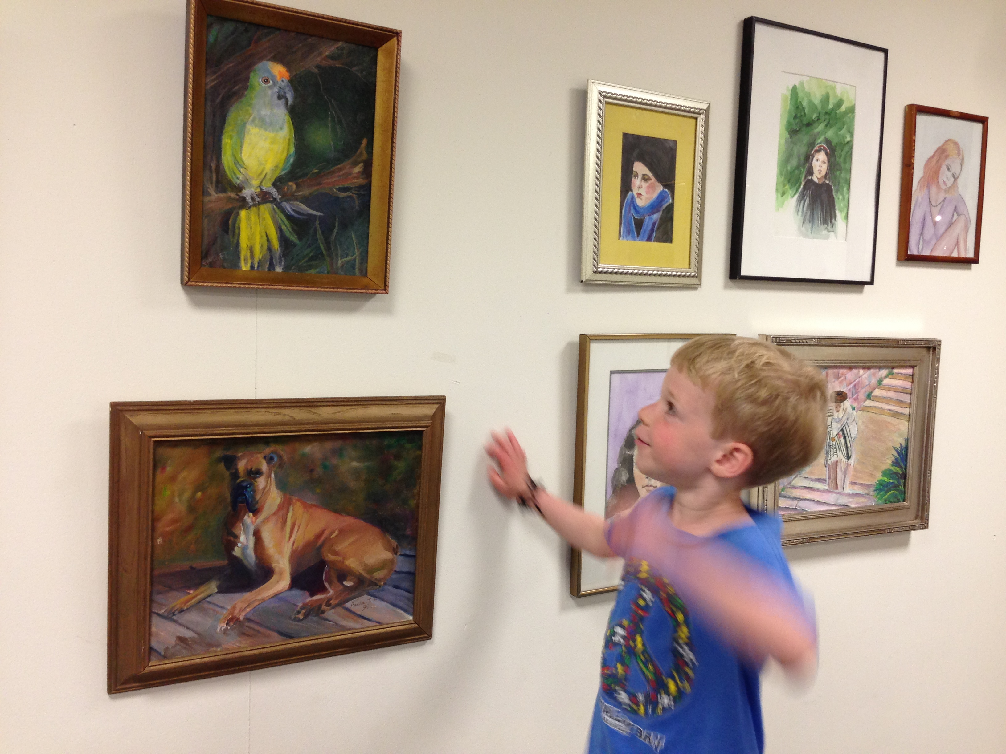 Our morning outing started with disappointment. The plan was to pick up DVDs at the Ossining Public Library that Levon would watch while I met with someone at Quimbaya. I’d forgotten that on Wednesdays the library doesn’t open until 1:00. So, my 5-year-old was just going to have to be polite and patient during my meeting. (That’s what little boys are known for, right?) By the time we got to Quimbaya the rain was torrential and our parking spot was on Church Street—all the way across the Sassinoro triangle and up half a block. We waited in the car a few minutes for the rain to let up. Then I scolded myself for being so ridiculous as to think walking that distance from my car to Quimbaya was an inconvenience. Heck, when I lived in Manhattan and Queens as a young adult, I would have considered this distance from a subway exit to my destination to be unbelievably close. Something about living in a home that frequently requires getting in a car and driving someplace, a place that often provides a parking lot, shifts ones expectations of “convenience”. Walking down Main after an inspiring conversation with a fantastic woman in our community, during most of which Levon quietly and slowly ate a bowl of ice cream, I gave him a choice. If we turn left, we get in the car and go to Stop n Shop. If we turn right, we walk to the Joseph G. Caputo Center and see an exhibit.