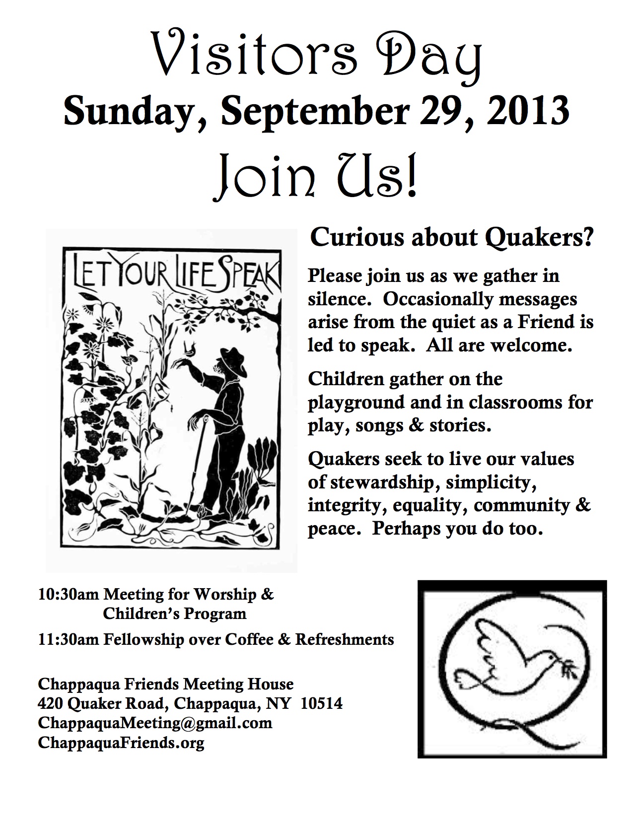 Tomorrow, Sunday, we will attend Chappaqua Friends Meeting at 10:30am at 420 Quaker Road in Chappaqua. This week is Visitors Week. If you’ve ever been curious to find out what Quakers do in our worship, please come. Why would people choose to sit together quietly in a room for an hour? I’m sure every Quaker, or Friend as we call ourselves, has his or her own reason for showing up. When we started attending the Chappaqua Friends Meetings I was just grateful that for one hour a week someone would entertain my kids and I could sit quietly without feeling guilty for not cooking, cleaning or caring for someone else.